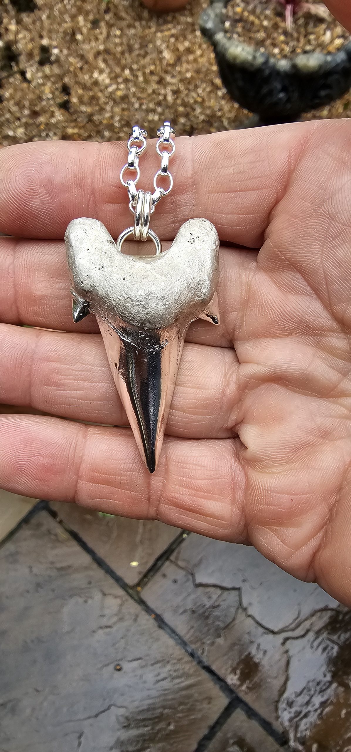 Cast from a real sharks tooth and measuring approx 60mm x 35mm