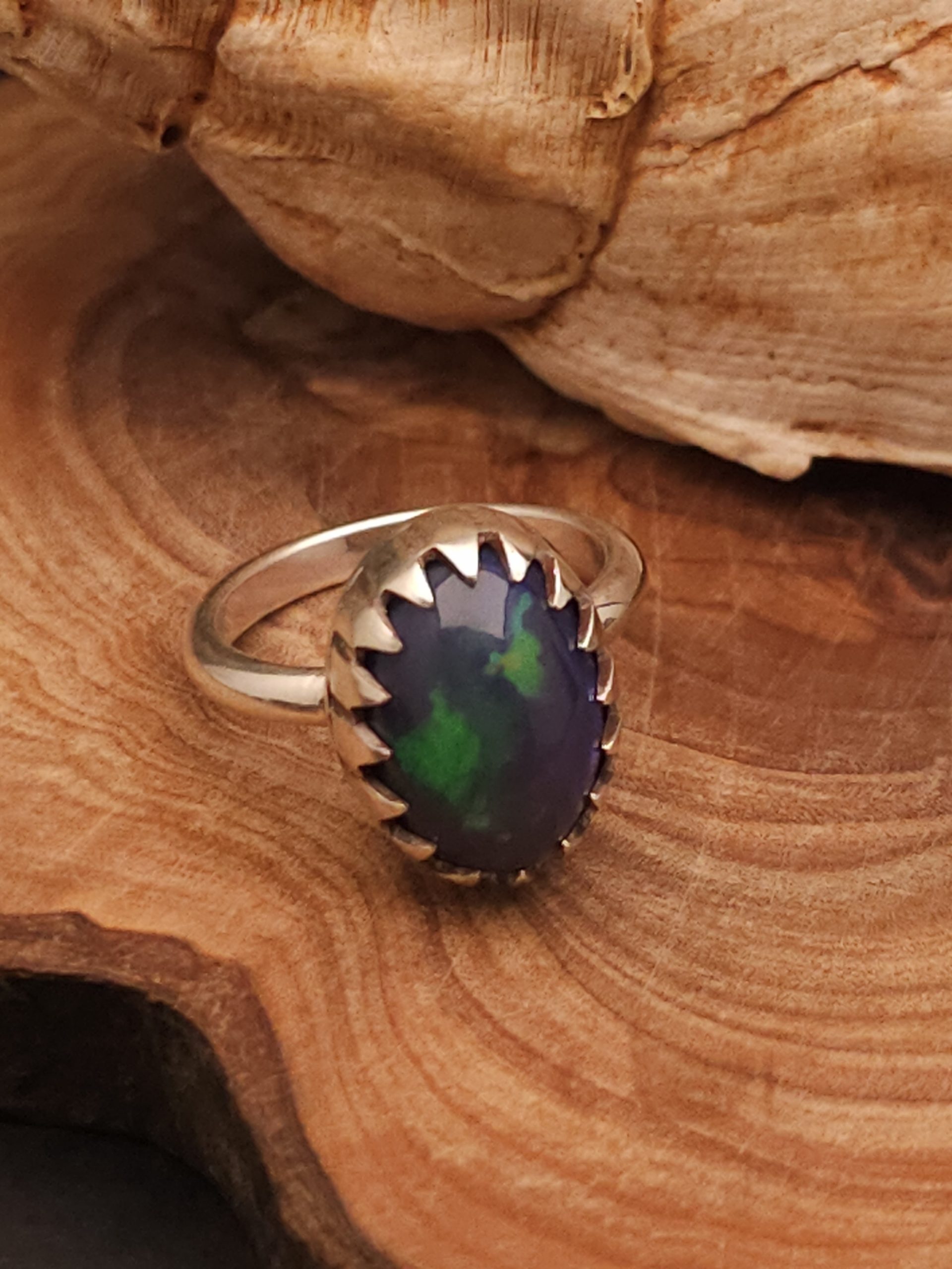 “Dive into enchantment with our Beautiful 5.80 Carat Opal Ring, set in a distinctive shark tooth bezel. Meticulously crafted, this unique piece showcases the mesmerizing play of colors in opal, framed by the rugged charm of a shark tooth setting. Elevate your style effortlessly with this handcrafted ring, a symbol of marine allure and bold elegance.”