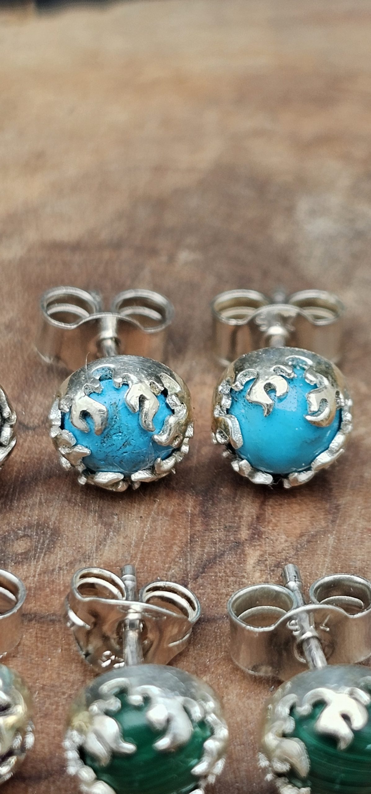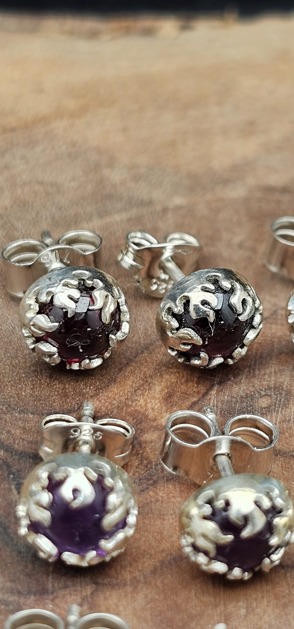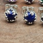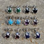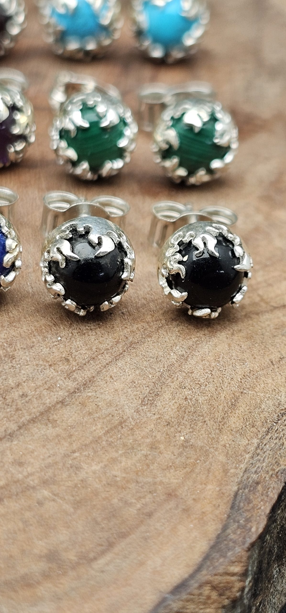 These handmade ear studs feature 5mm amethyst, onyx, turquoise, garnet, and lapis stones, each set in a sterling silver fire bezel. The vibrant gemstones are beautifully highlighted by the sleek, flame-like setting.