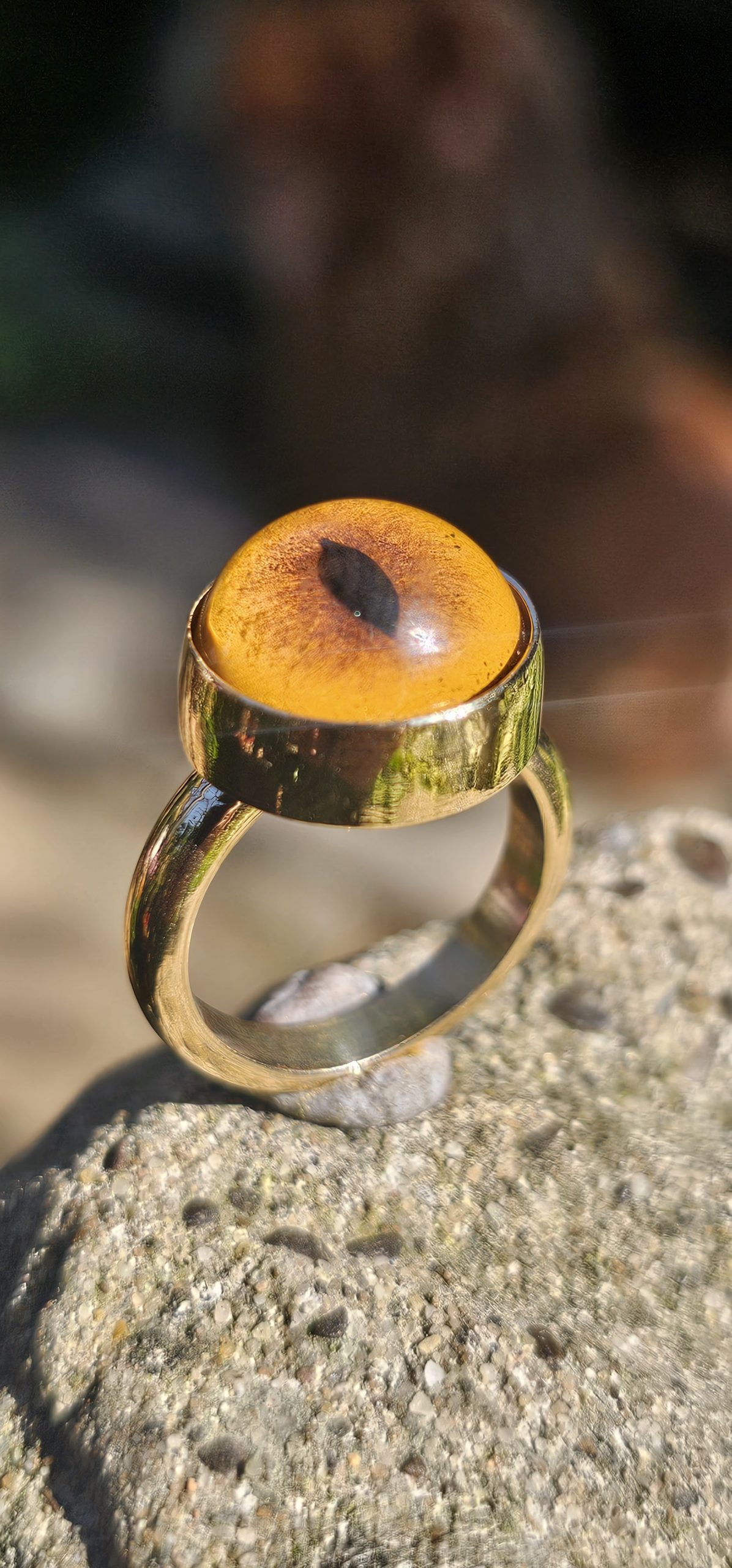 Hand-forged from reclaimed 9ct gold, this ring is set with a premium-grade reverse-painted, hand-blown glass fox eye. Each eye is exhibition quality, alive with depth and an uncanny gaze that feels as though it sees through shadow.