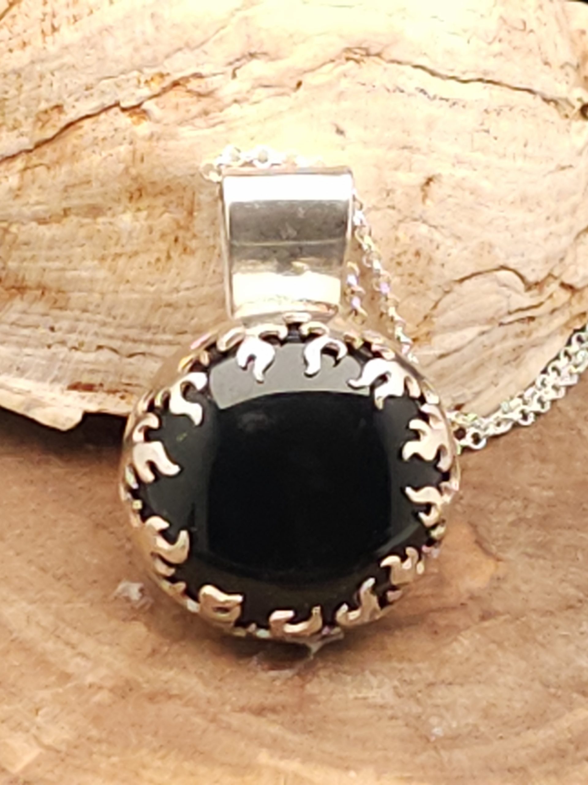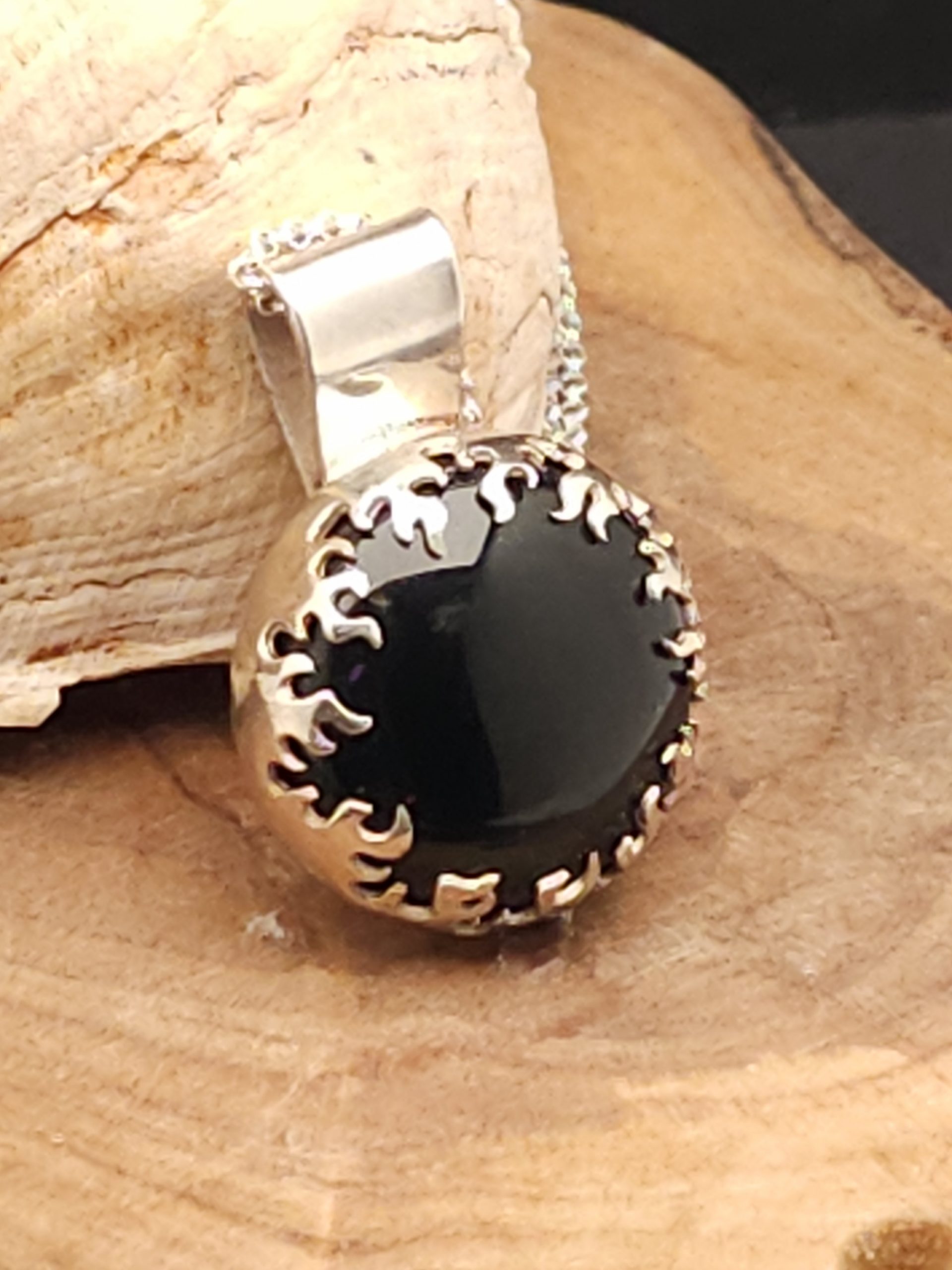 Ignite your style with this handmade silver onyx and flame bezel pendant. This pendant features a striking onyx centerpiece embraced by a flame-inspired silver bezel. The combination of sleek silver and the deep allure of onyx creates a captivating and unique piece that adds a touch of sophistication to any ensemble. Elevate your look with this handcrafted pendant that seamlessly blends elegance and intrigue.