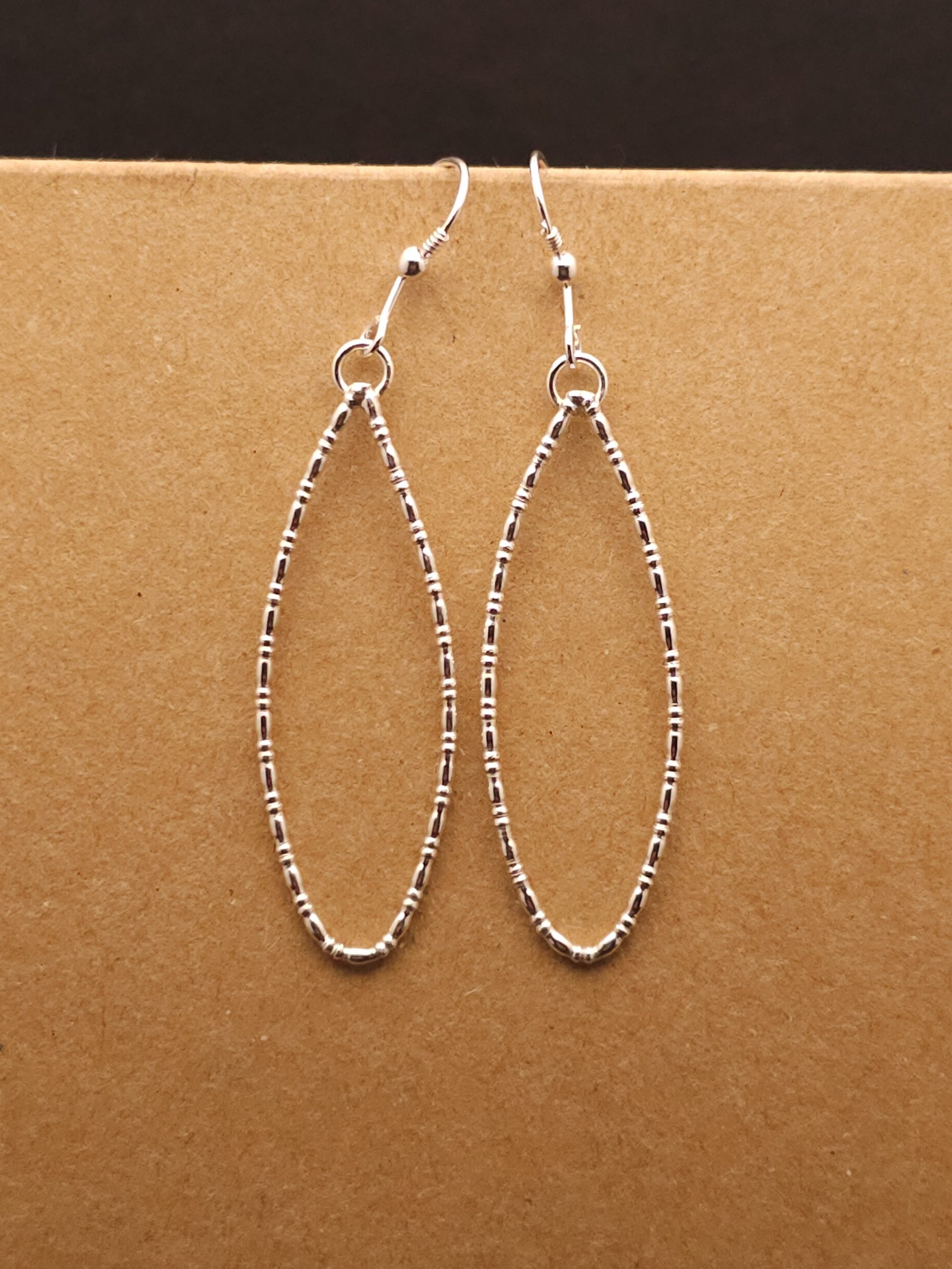 “Dangle in sophistication with our Silver Rondelle Oval Earrings. Meticulously crafted, these unique pieces feature an elegant oval shape with a rondelle-inspired design, adding a touch of timeless charm to your style. Elevate your look effortlessly with these handcrafted earrings, a symbol of classic elegance and refined taste.”