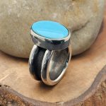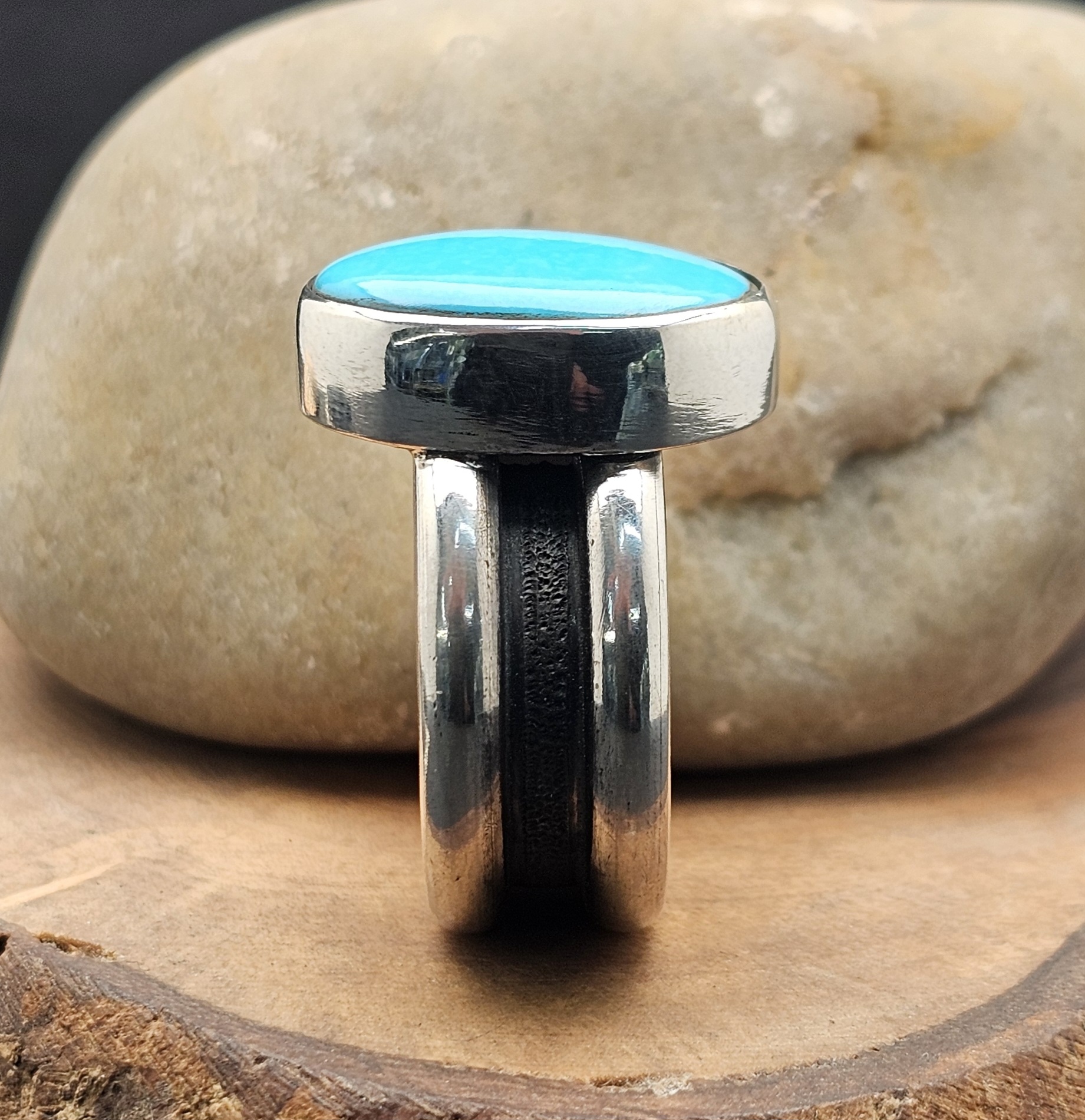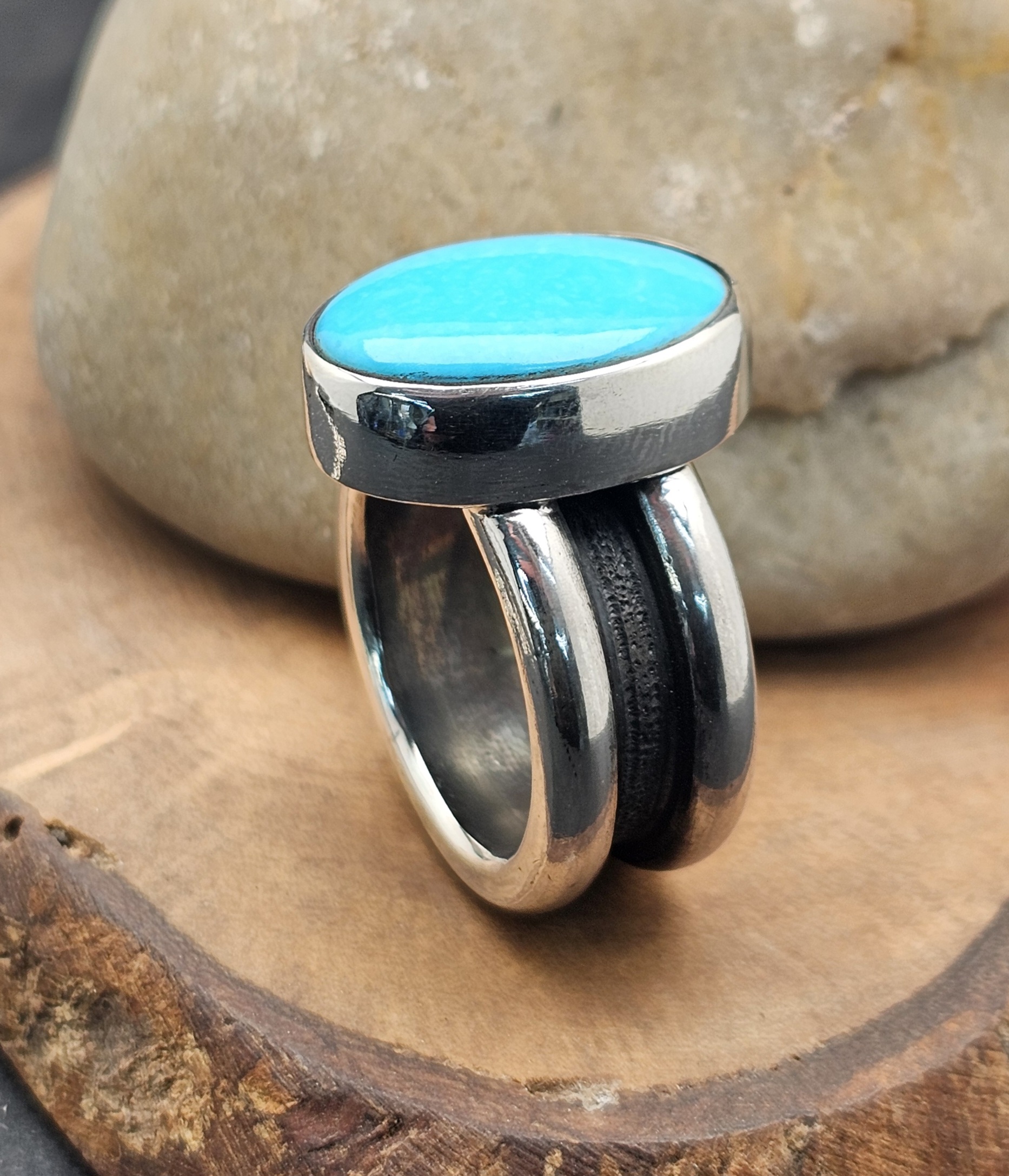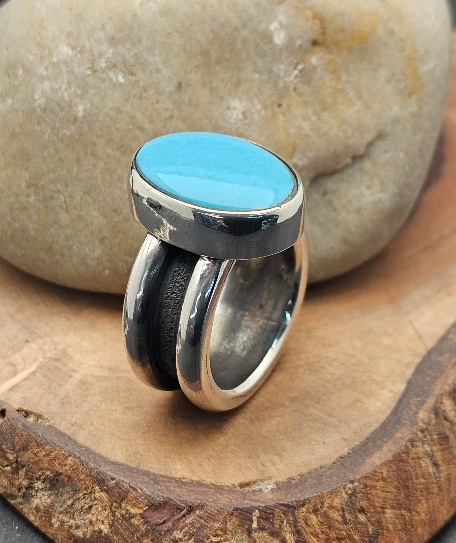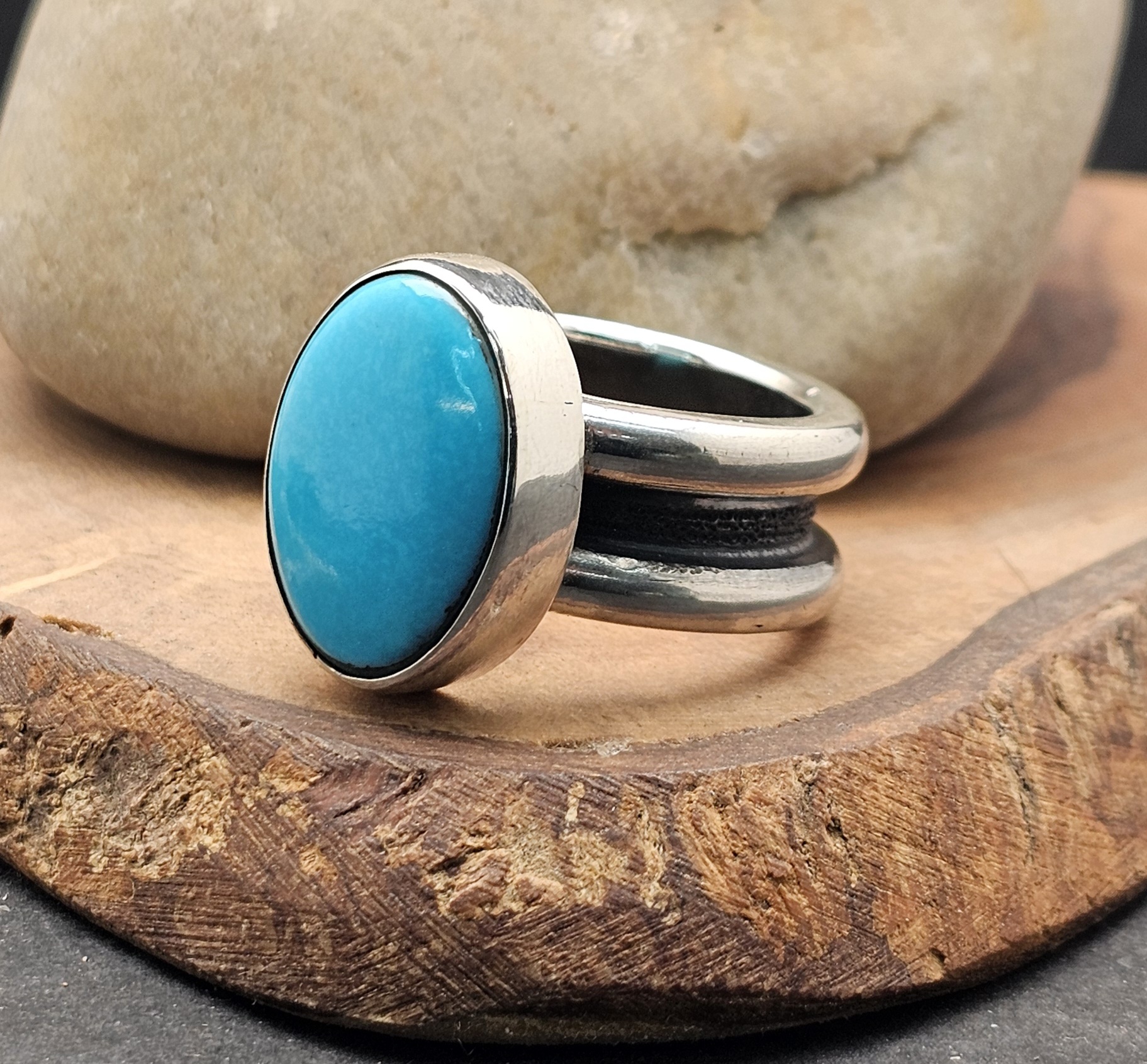Set with a flawless Sleeping Beauty turquoise, prized for its clean, uninterrupted sky-blue tone, the stone brings clarity and contrast to the raw silver beneath it.