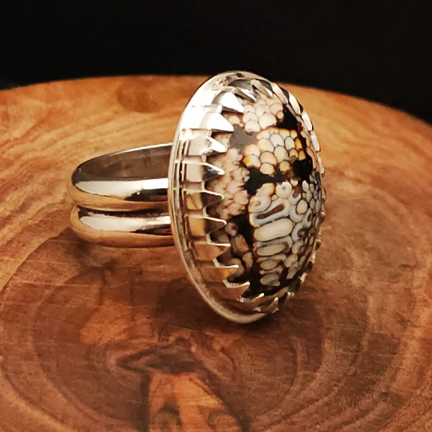 This handmade ring features a detailed snake skin pattern, set in solid sterling silver and framed in my signature shark tooth bezel.