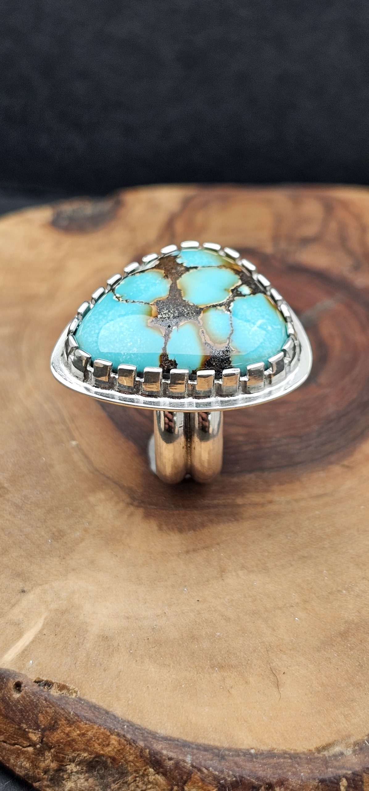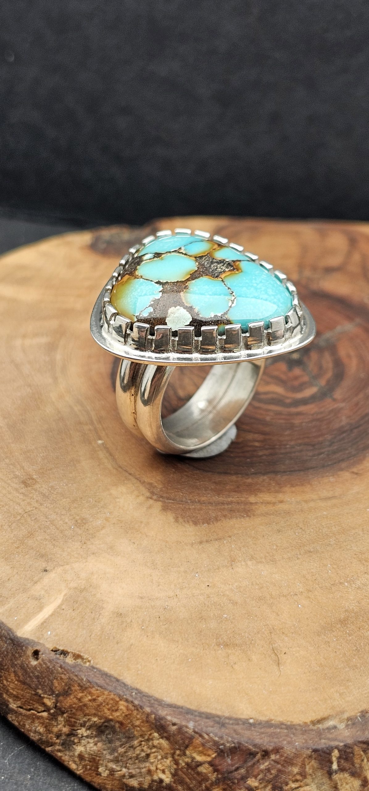 This stunning Turquoise ring is a real eye catcher. Set in a sterling silver castellated bezel.