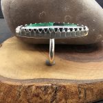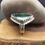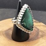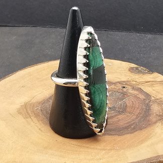 This pendant features a hand-carved malachite stalactite, uniquely set in a sterling silver bezel designed to resemble a shark tooth. The bold contrast of the rich green stone with the sleek silver setting creates a striking, natural-inspired piece.