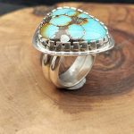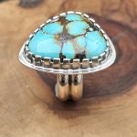 This stunning Turquoise ring is a real eye catcher. Set in a sterling silver castellated bezel.